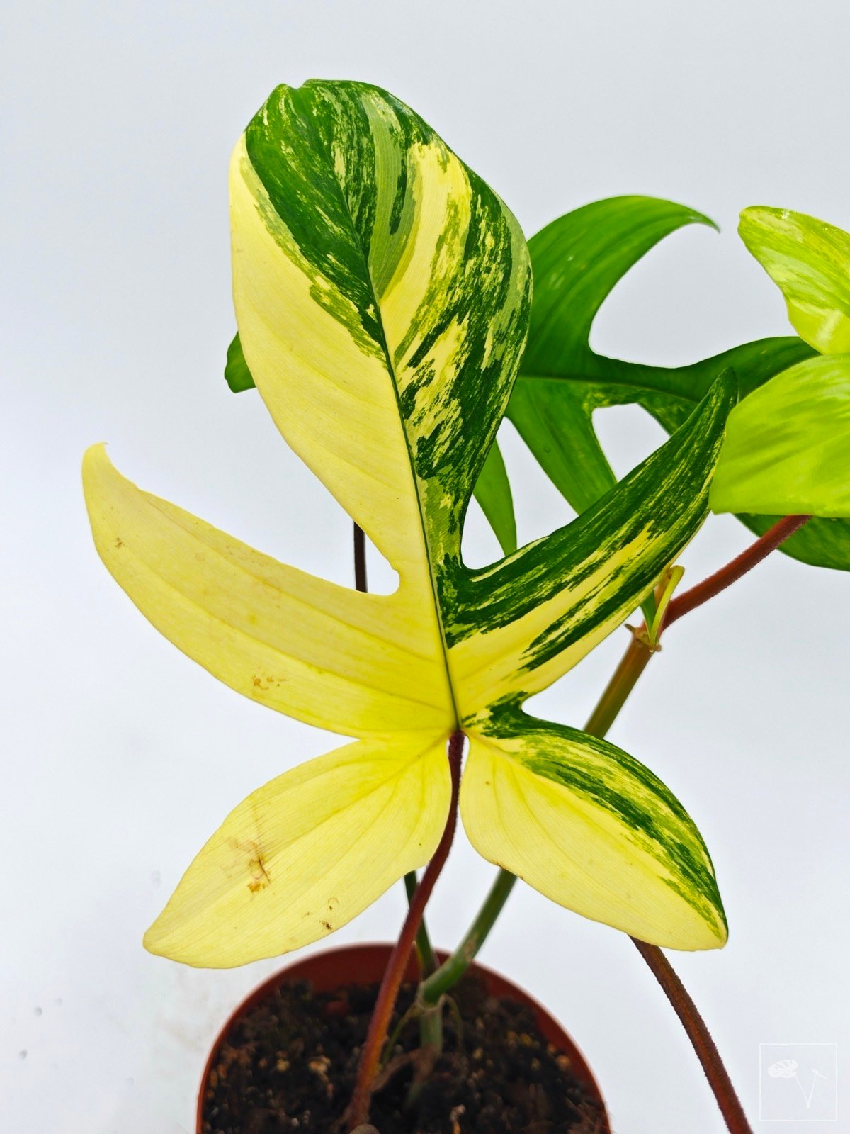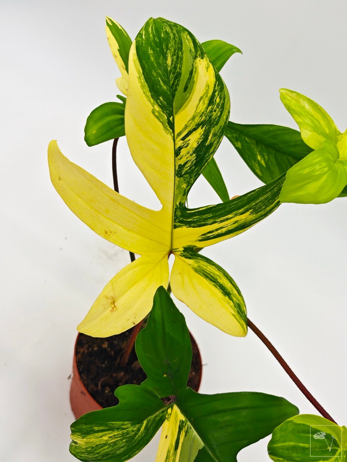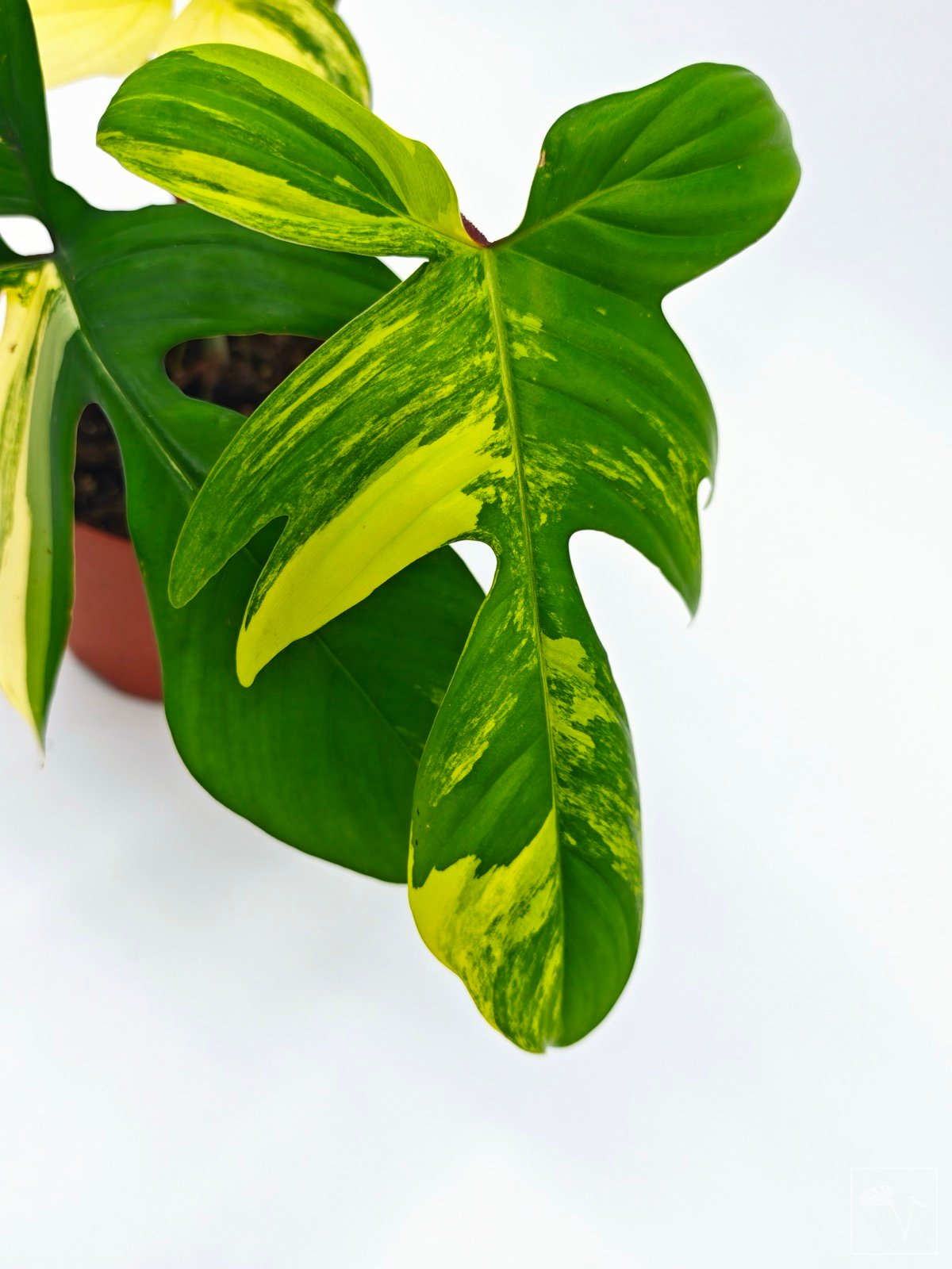 Conocida por sus espectaculares hojas lobuladas con una impresionante variegación en tonos crema, amarillo y verde. Cada hoja es única, con patrones que pueden variar desde sutiles matices hasta grandes áreas de color contrastante.